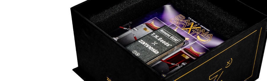 Banana GOAT è un'esclusiva varietà in edizione limitata che troverai solo da Zamnesia. Con questa premessa, ogni confezione da 6 semi contiene un certificato di autenticità ed è venduta all'interno di un cofanetto elegante insieme ad una miriade di altri oggetti che ti consentiranno di vivere un'esperienza favolosa, a prescindere che tu decida di fumarla o vaporizzarla.