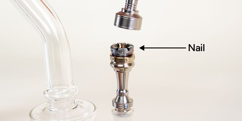 - Un "Chiodo", o nail, le cui dimensioni devono adattarsi a quelle dell'apertura normalmente destinata ad un normale braciere. Si tratta di una sottile cannuccia in metallo che termina con un piccolo braciere, appositamente disegnato per sciogliere i concentrati.