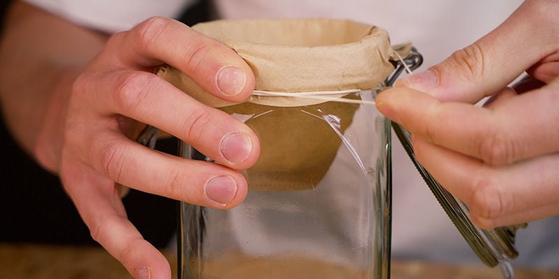 Prima di togliere l’alcol isopropilico e il vasetto di fiori dal congelatore, metti un filtro da caffè sull’apertura del barattolo da 1 litro e fissalo con degli elastici. Assicurati che il filtro sia concavo, in modo che la soluzione possa rimanere al suo interno, e posiziona il setaccio sopra il filtro.